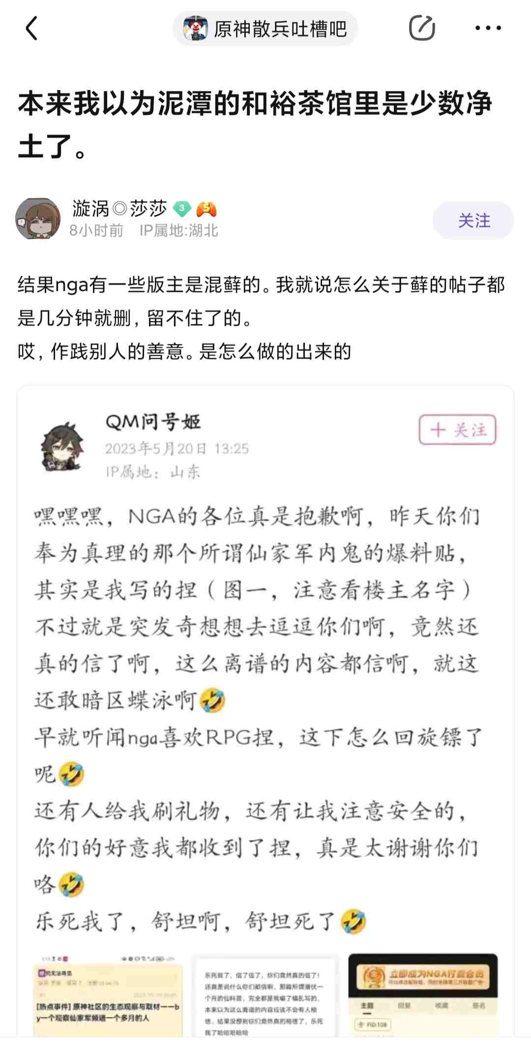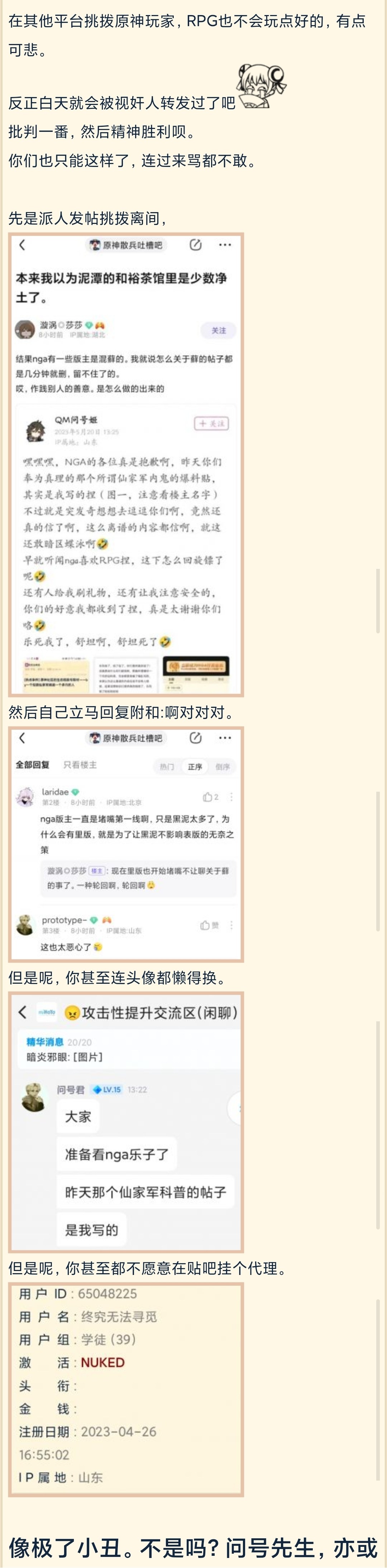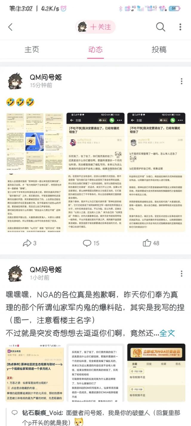 次日,QM问号姬在自己的B站动态公布了自己反串的事实,并嘲讽曾在NGA安慰自己的人。