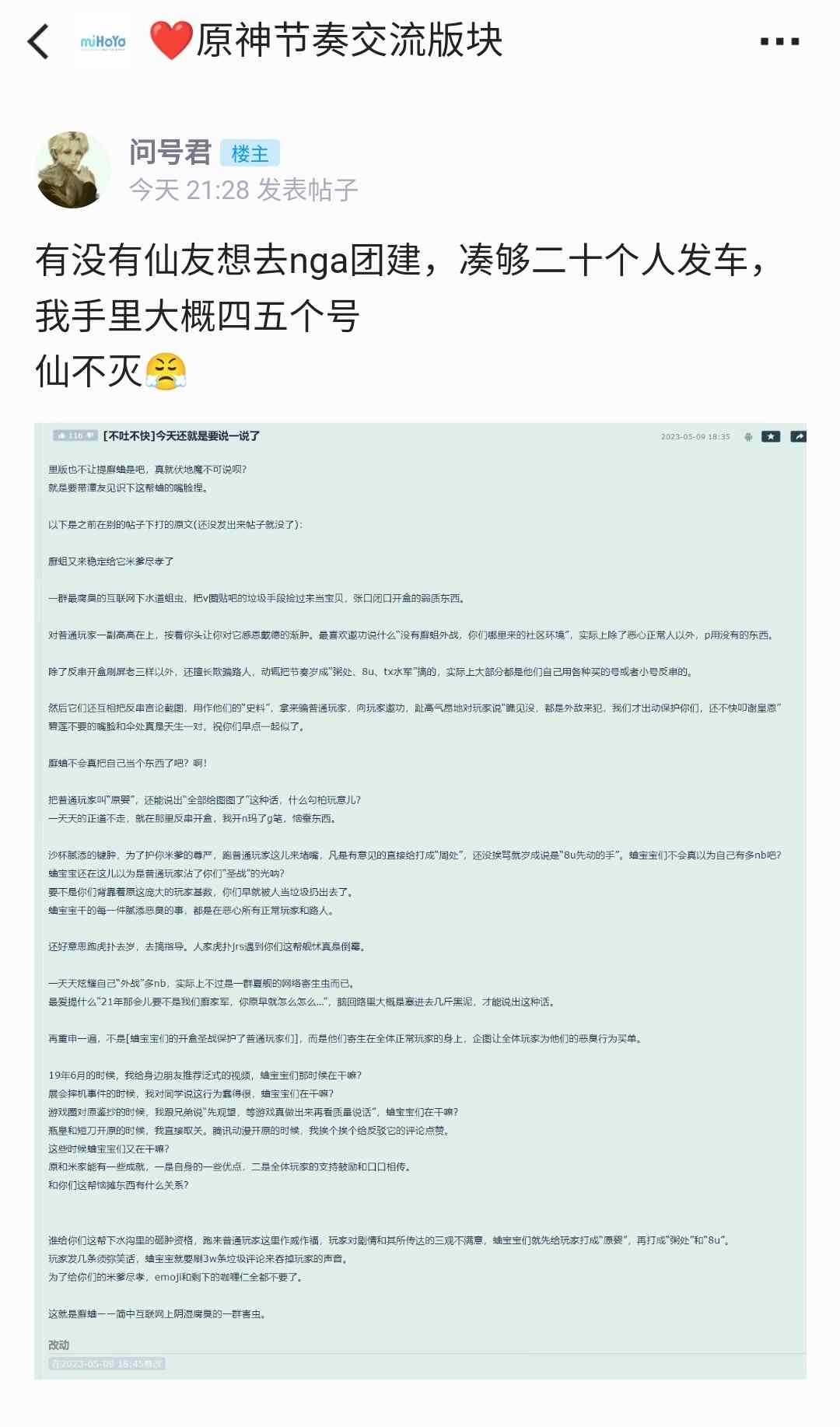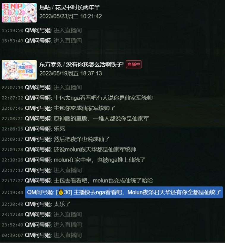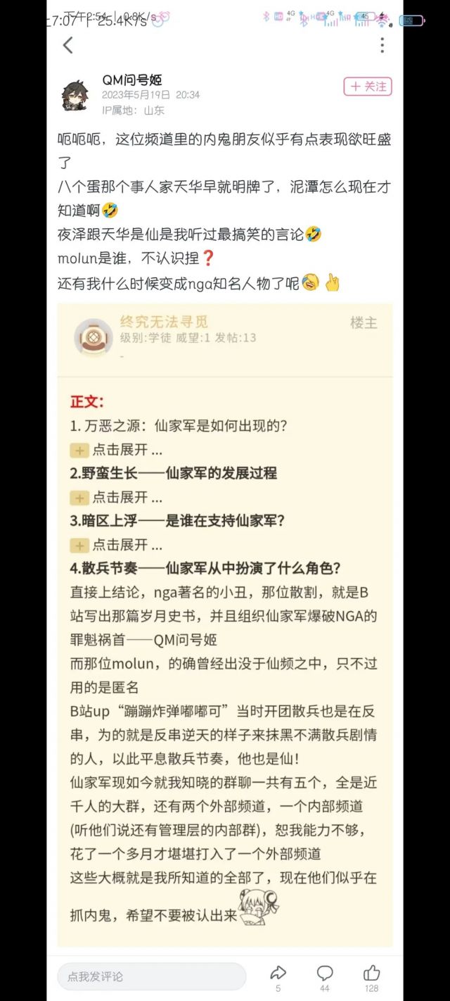 仙家军QM问号姬在2023年5月19日通过假装仙家军间谍“投诚”NGA,并在NGA发布了所谓的仙家军内幕。