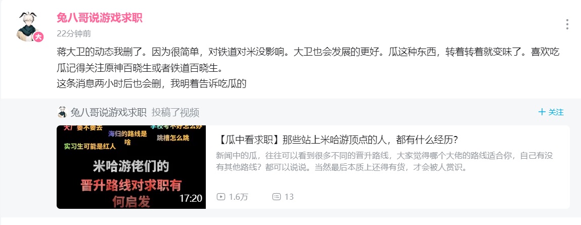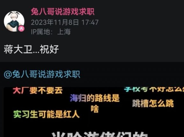B站账户“兔八哥说游戏求职”2023年11月8日在B站发布一条动态。