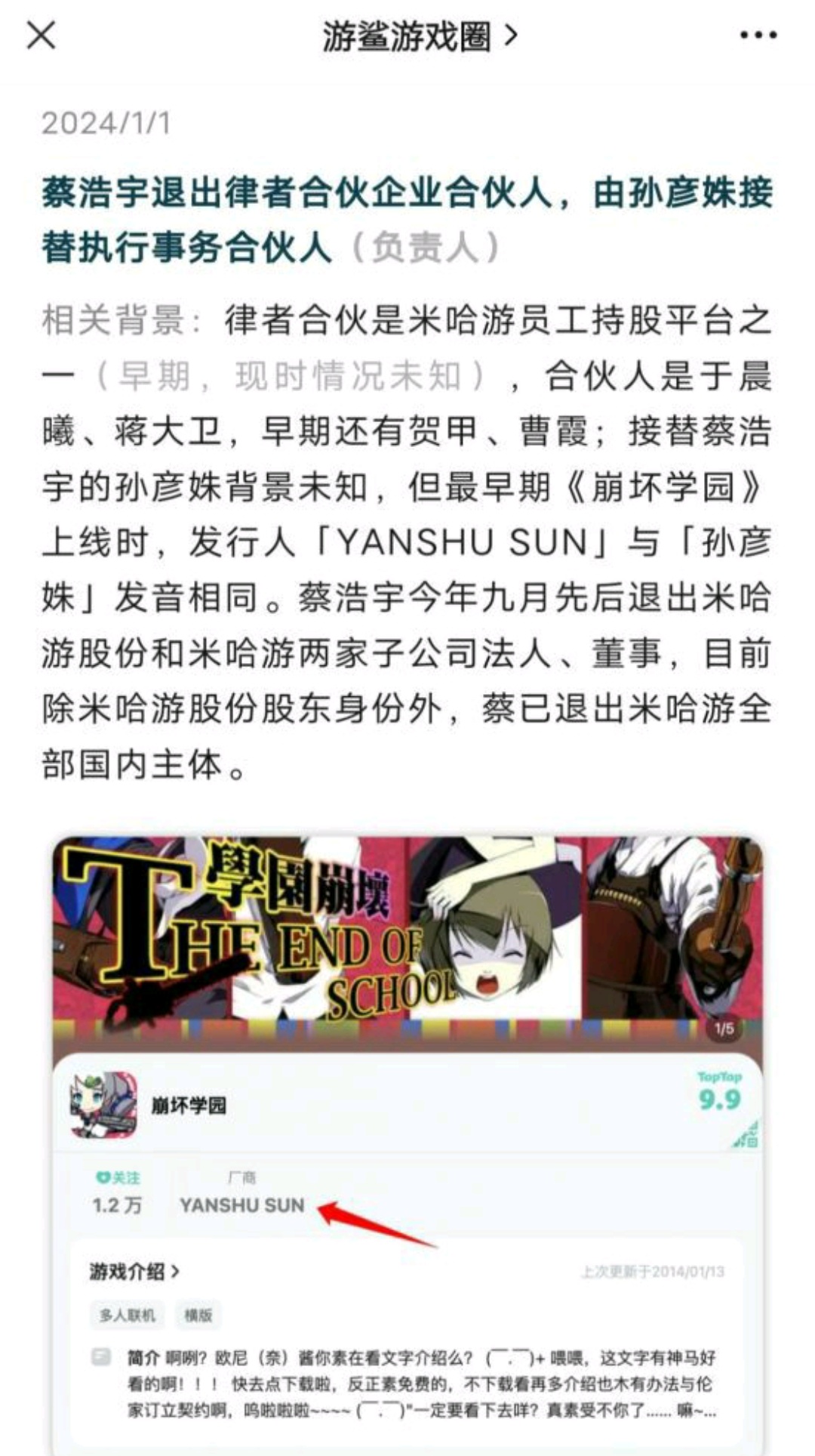 接替蔡浩宇的孙彦姝背景未知,但最早期《崩坏学园》上线时,发行人「YANSHU SUN」与「孙彦姝」发音相同。