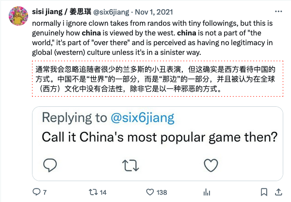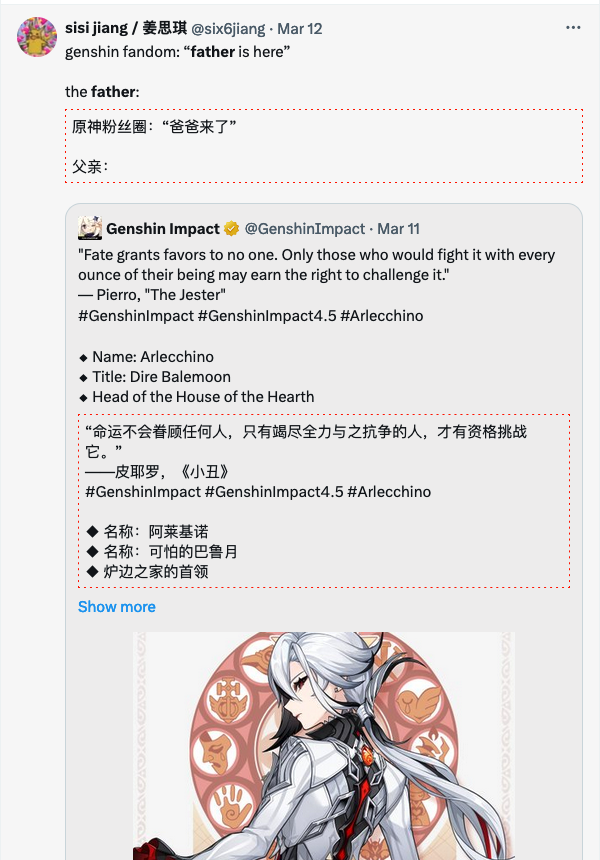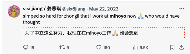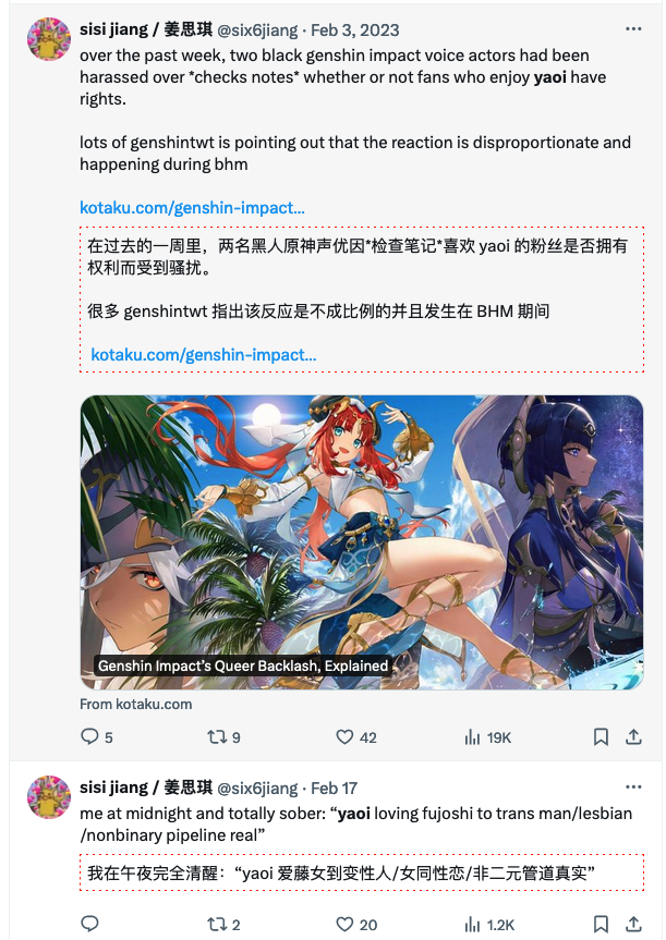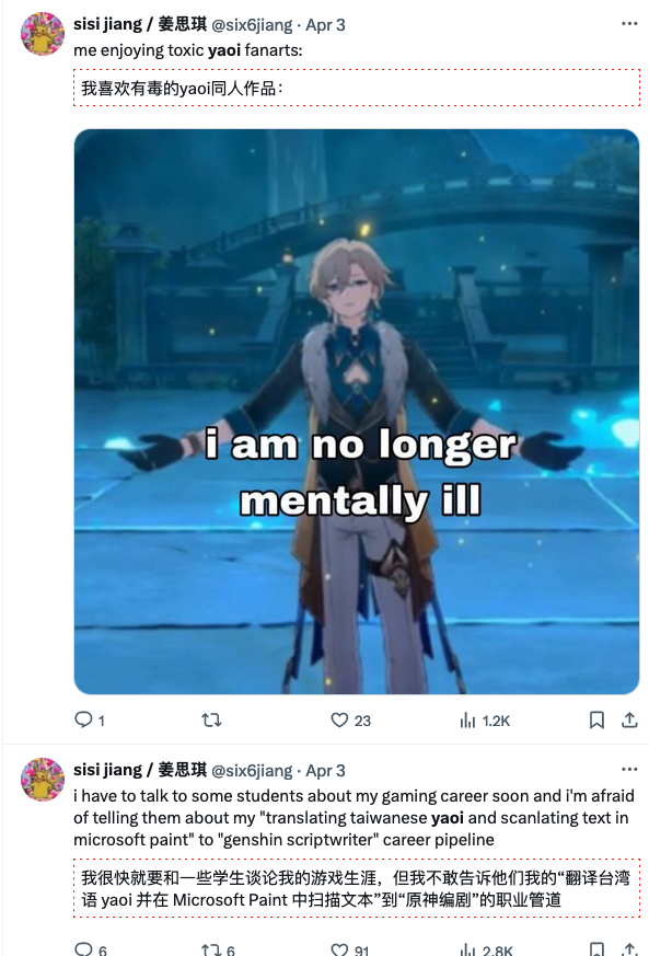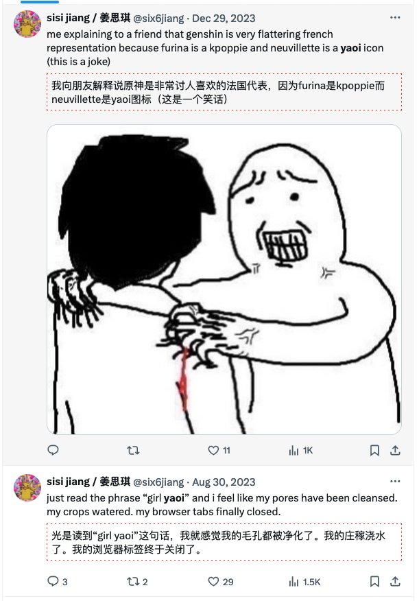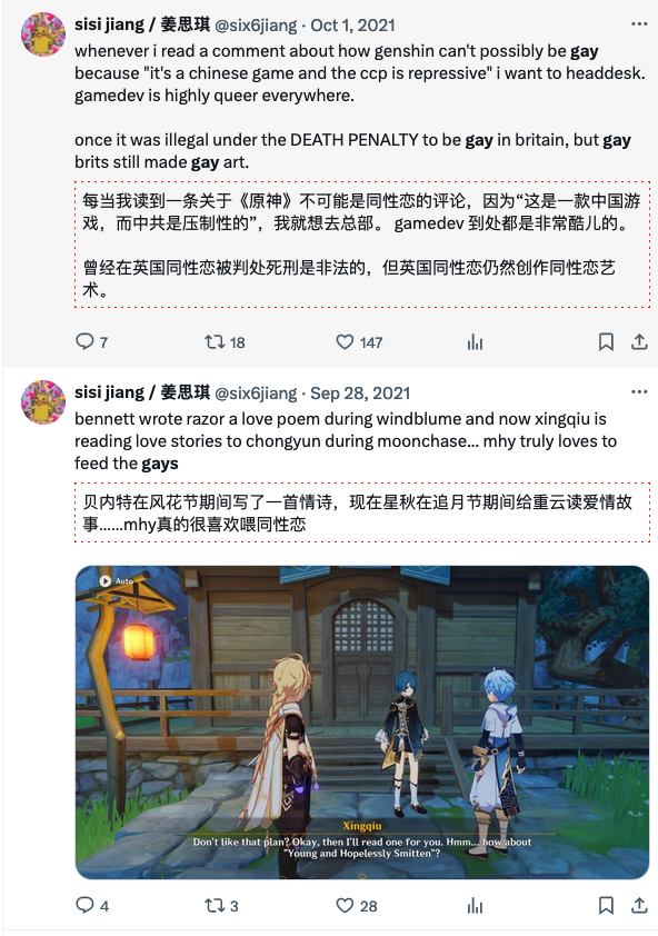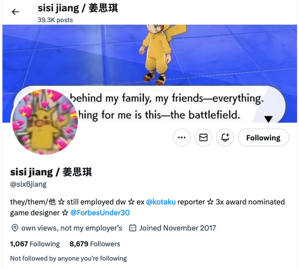 sisi jiang,跨性别者和同性恋者。前kotaku记者,现原神编剧(负责原神英文频道版本前瞻视频和hoyofair同人视频的编剧)。
