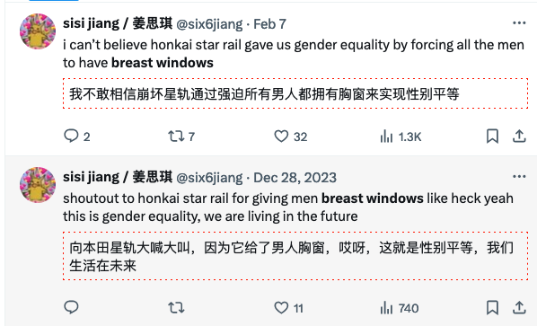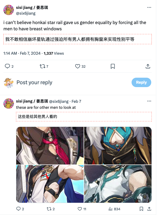我不敢相信《崩坏:星穹铁道》通过让所有男性角色穿上带奶窗的衣服来实现了性别平等。 ...