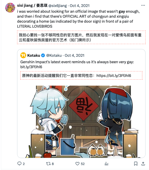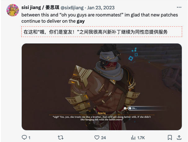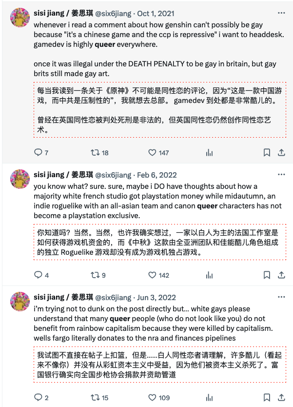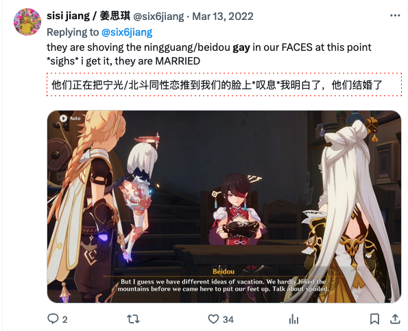 每当我读到有人评论说《原神》不可能有同性恋内容,因为“那是一款中国游戏,而且zhonggong打压”,我就想撞桌子。实际上,全世界的游戏开发领域都广泛存在着酷儿文化。