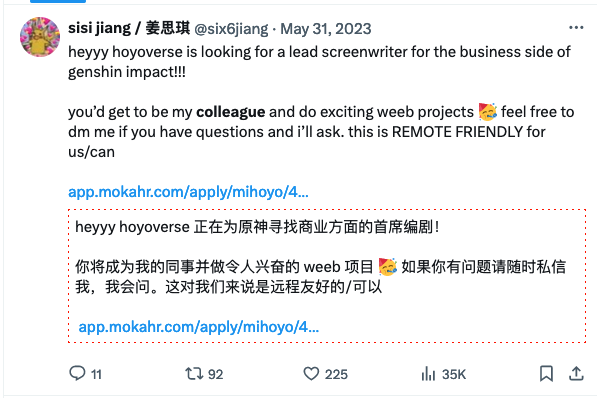 在LGBT组织北京同志中心的工作中,他担任了发展主管,带领了职场多元计划。而他在加入米哈游后的工作内容包括在公司层面制定企业社会责任(CSR)的策略,其带领职场多元计划的经历就发挥了作用,合理猜测更多的sisi jiang已经或即将加入米哈游。